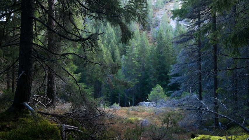 Tiveden is also notable for its forest structure. Compared to much of southern Sweden, which has been heavily shaped by forestry, this area contains a higher proportion of older and less managed forest. Trees of different ages grow together, and dead wood is commonly left in place, contributing to biodiversity. Moss and lichen cover large parts of the ground and rock surfaces, and the forest floor tends to be dense. The combination of geology and vegetation creates a layered environment where visibility is often limited to shorter distances.