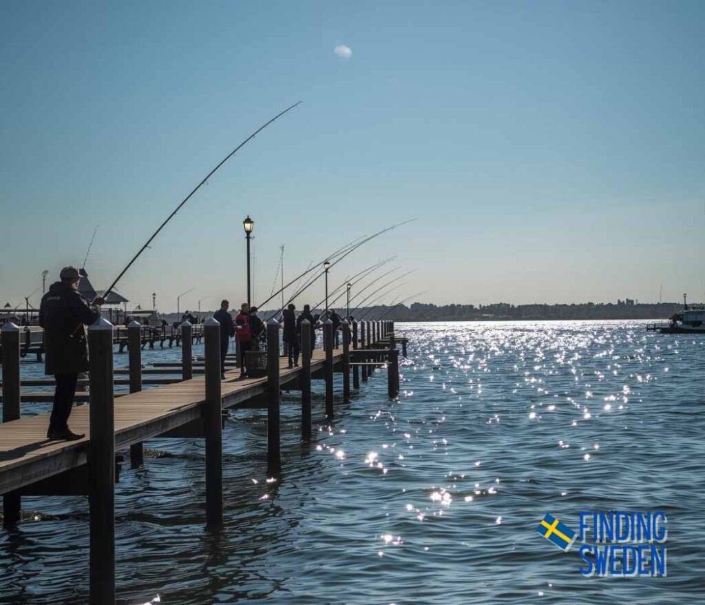 Large group fishing at the piers in Hammarö, in northern Vänern.